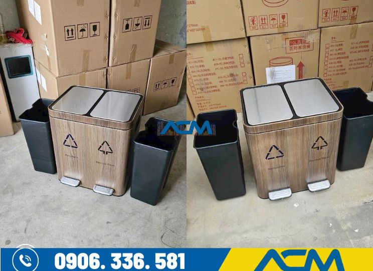 2 Thùng rác inox 2 ngăn – bề mặt họa tiết gỗ đẹp